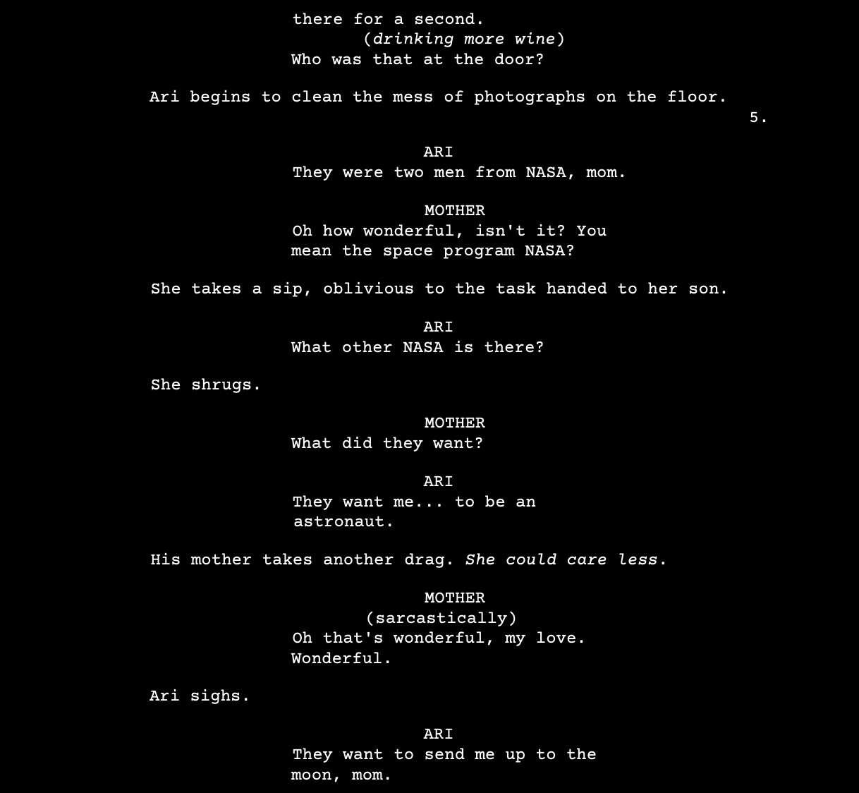 This was a screenplay I wrote, the opening to a film about a kid who gets recruited to go to the moon.