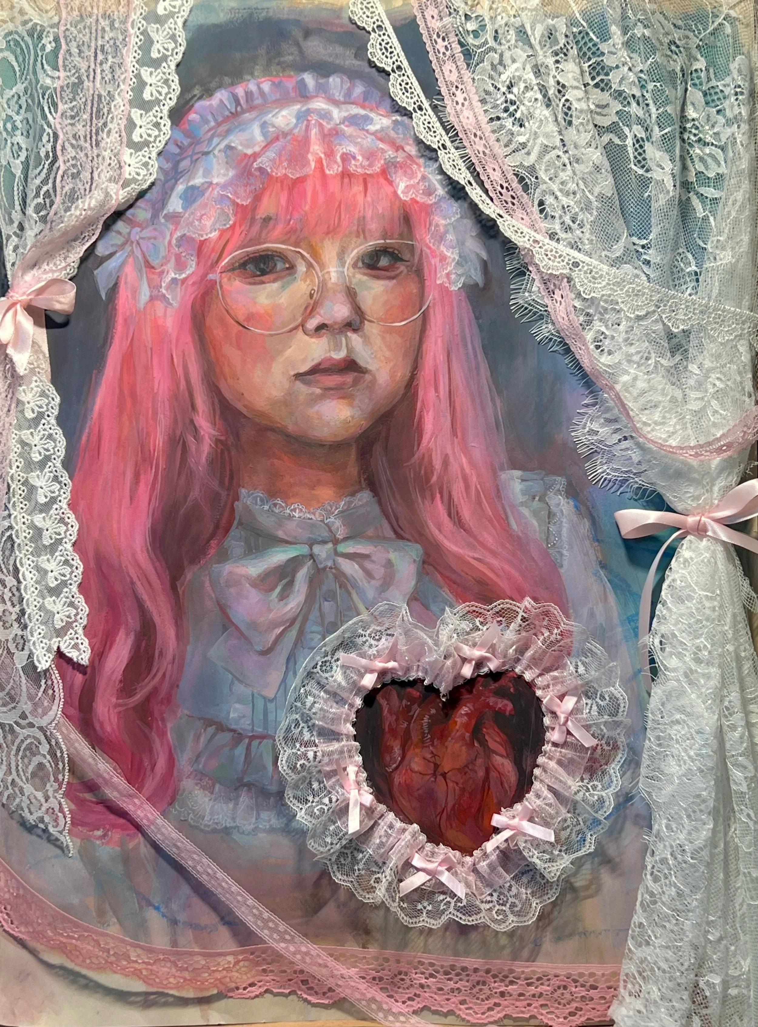 This portrait is a reflection of my struggles with my art, specifically, how it has affected my psyche. In a veil of lace, I retreat into myself as the pressure of perfection eats away at me. Through contrasting hues, I juxtapose the soft colors of the illusion with visceral graphics to highlight the fears that seep through the seams.