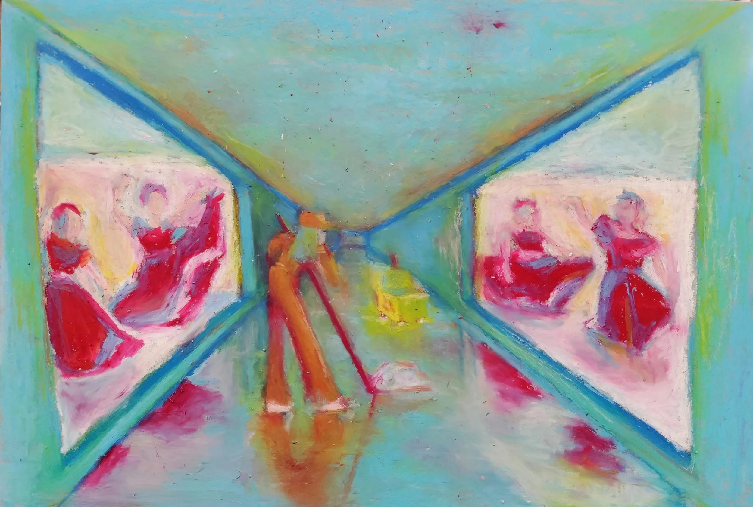 My piece is based on my mom who has stayed in cleaning jobs all her life. She cleans houses that belong to people who usually are wealthier than our family, leading to endlessly comparing herself to those who are in a better position. This is represented by the four mannequins displayed in bright red, traditional garments versus the hunched figure.