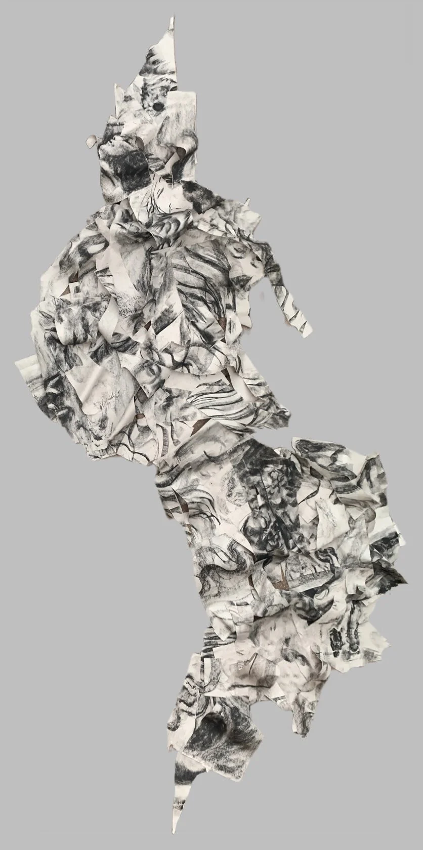 For much of my life, I have felt the need to create art as perfectly as possible, erasing and re-erasing and getting rid of any flaws from my subjects. But life isn't like this—it is rough, it takes unforeseeable turns, and it's imperfect—but I think that's what makes it beautiful. With this piece, I drew nine of my favorite moments and textures, each drawing taking between half an hour and two hours, and then ripped them up to create this sculpture: an oscillation of my life and memories. It pained me to tear these moments, but like life, memory is flawed; it is pieced together by neural networks and rearranged haphazardly. To be human, then, is to embrace the roughness—the amalgamation of what is real and what is altered through a fluctuation of 2D and 3D space.