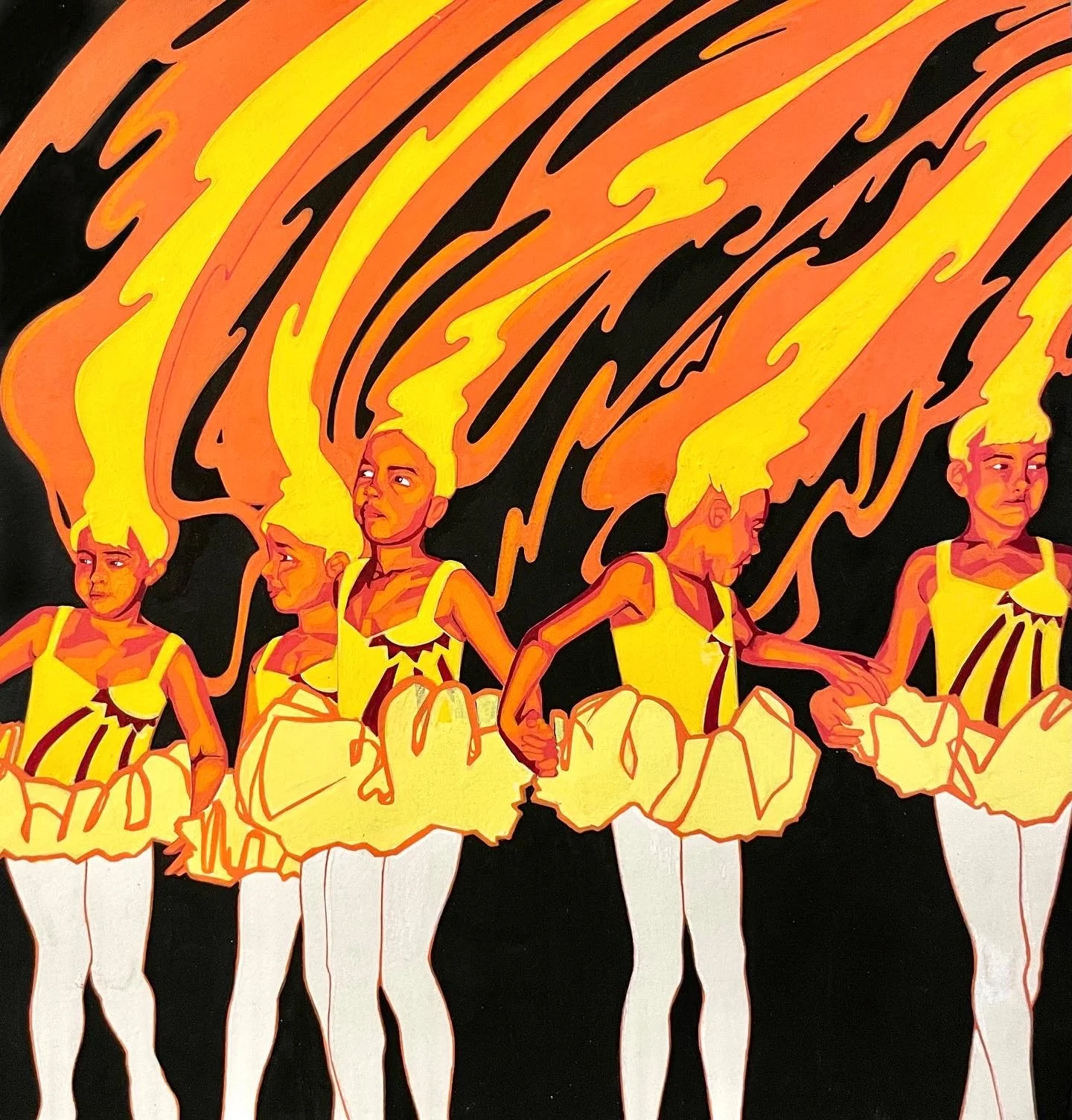 This piece was inspired by an old photo of my mother. Ballerinas adorned in delicate golden tutus display subdued body language, yet such personality is present in their faces. I wanted to emphasize this personality with a bold motif of flames to show this juxtaposition in a more salient manner.