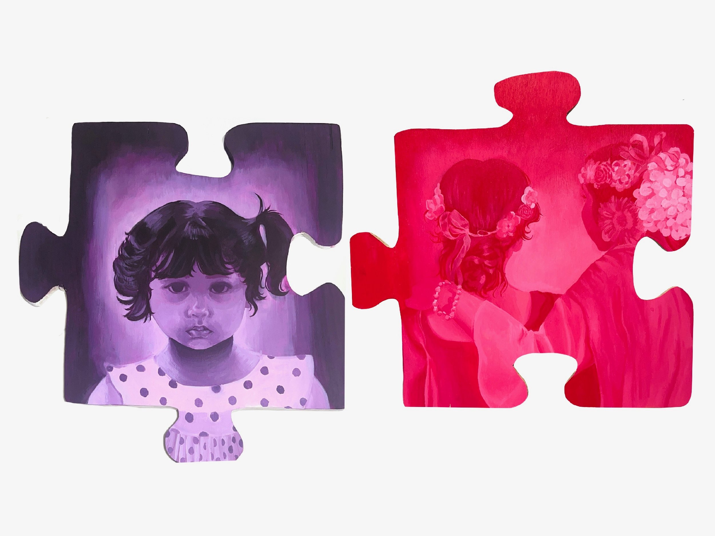 A diptych connecting two portraits, one of my younger self, unaware of my heritage, and the other of my friend and I looking forward with our backs faced towards the audience, accepting this new cultural identity and not looking at the past. The vibrant monotonous colors were an artistic decision on my behalf; vivid, bright colors make it difficult for the artwork to be forgotten. This piece is about accepting a new version of yourself and letting go of what you once were. It is true that my past is what created me, but my present is who I am. I wanted to showcase that in this display of not-quite-fitting puzzle pieces. Of my past, looking at what I will be, of who I can be.