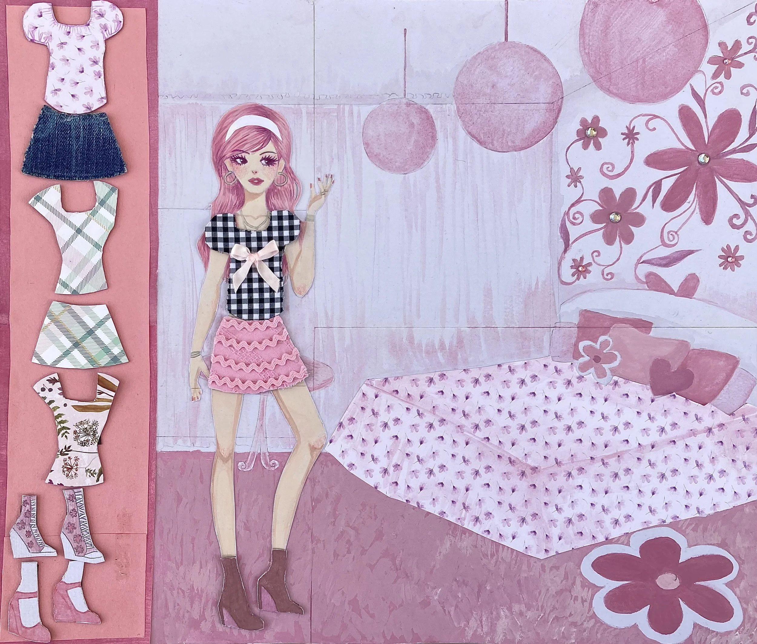 This piece is for those girls who grew up playing those fashion web games in the early 2010s. I got my inspiration from these games as I loved to play them as a kid. I really like experimenting with different ways to convey an idea; In this case, my usage of materials. I didn’t want to only make a painting or a drawing, but an interactive experience. With the magnets, you can change the clothes of the model, which makes engaging with the viewer.