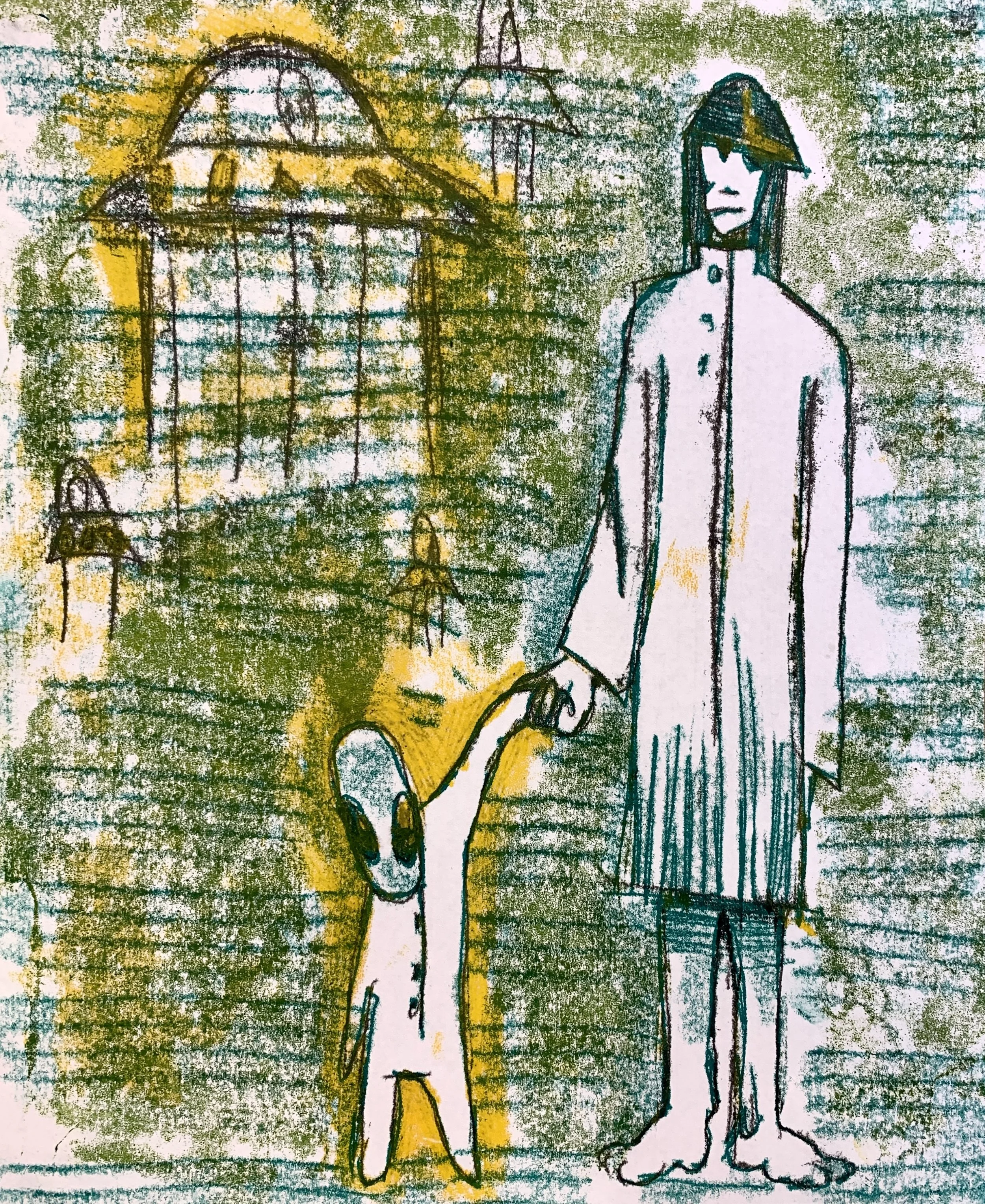 This piece is a trace monoprint depicting a man holding the hand of a toddler wearing an alien mask in order to get indoctrinated by aliens. It follows this whole made-up story in my head about my alien friends. This piece was done for my printmaking class, and it was a fun experience. The technique itself helped emphasize my subject matter.