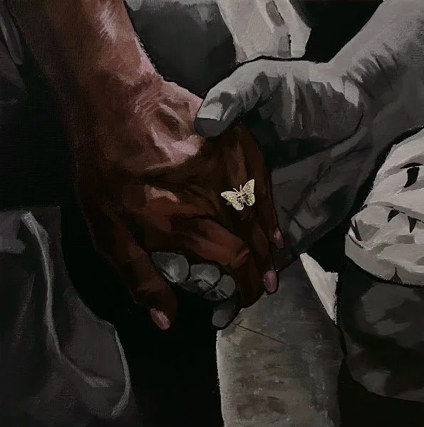 This piece represents how I view my grandma and her father: as butterflies in my life, since butterflies represent those who have passed on. Though my grandma has not passed, her father has, and she absolutely loves butterflies, and she is the one who told me that butterflies represent our loved ones. This picture was taken moments before her father passed, and I made it to show how she is in color, while the world around her is in black and white. The butterfly ring further connects the butterfly symbolism to her relationship with me and her father (my great-grandpa).